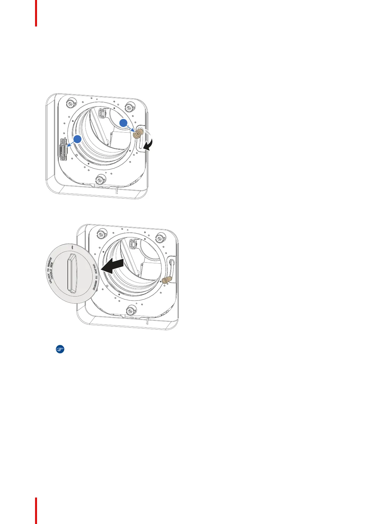 1. Place the lens holder in the “unlocked” position. Do this by pulling the lens lock handle (reference 1,
