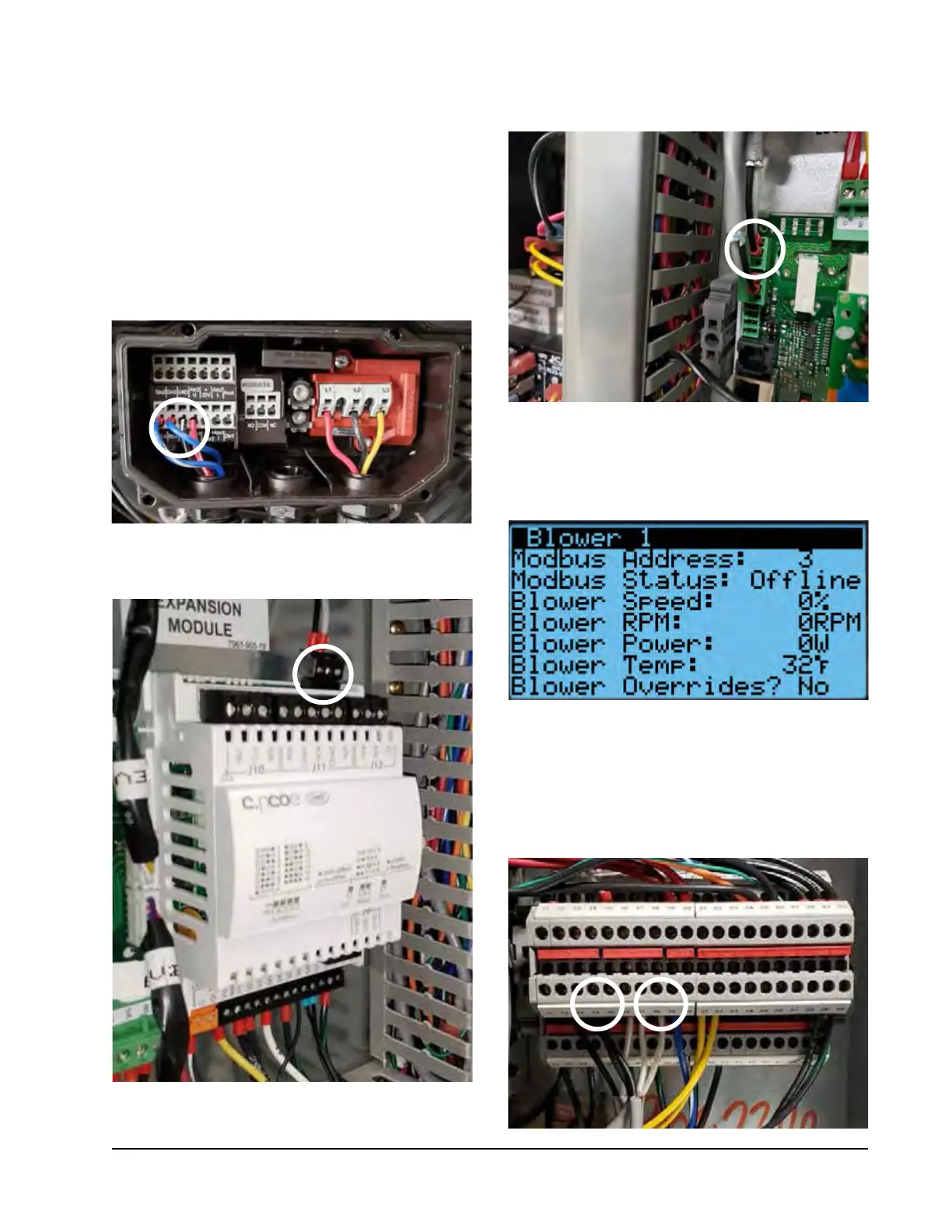 Bard MEGA-TEC W090A - Figure 60 Disconnect Condenser Fan Communication Wires; Figure 61 Unplug Modbus from Expansion Module; Figure 62 Verify Modbus Is Connected to PLC Board; Figure 63 Verify Blower Is Online