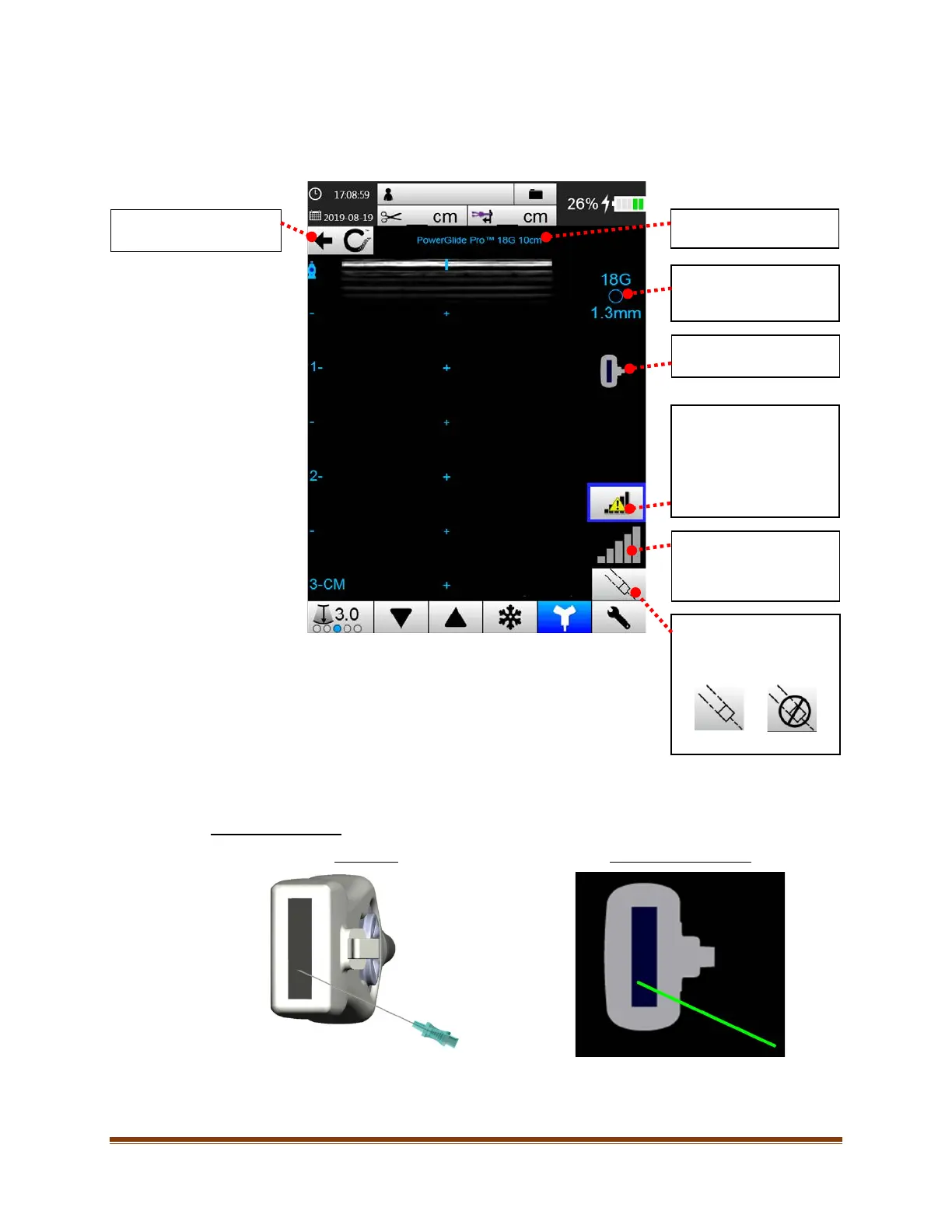 The probe face overlay for an out-of-plane insertion may be turned off in the Cue™ Needle Tracking System