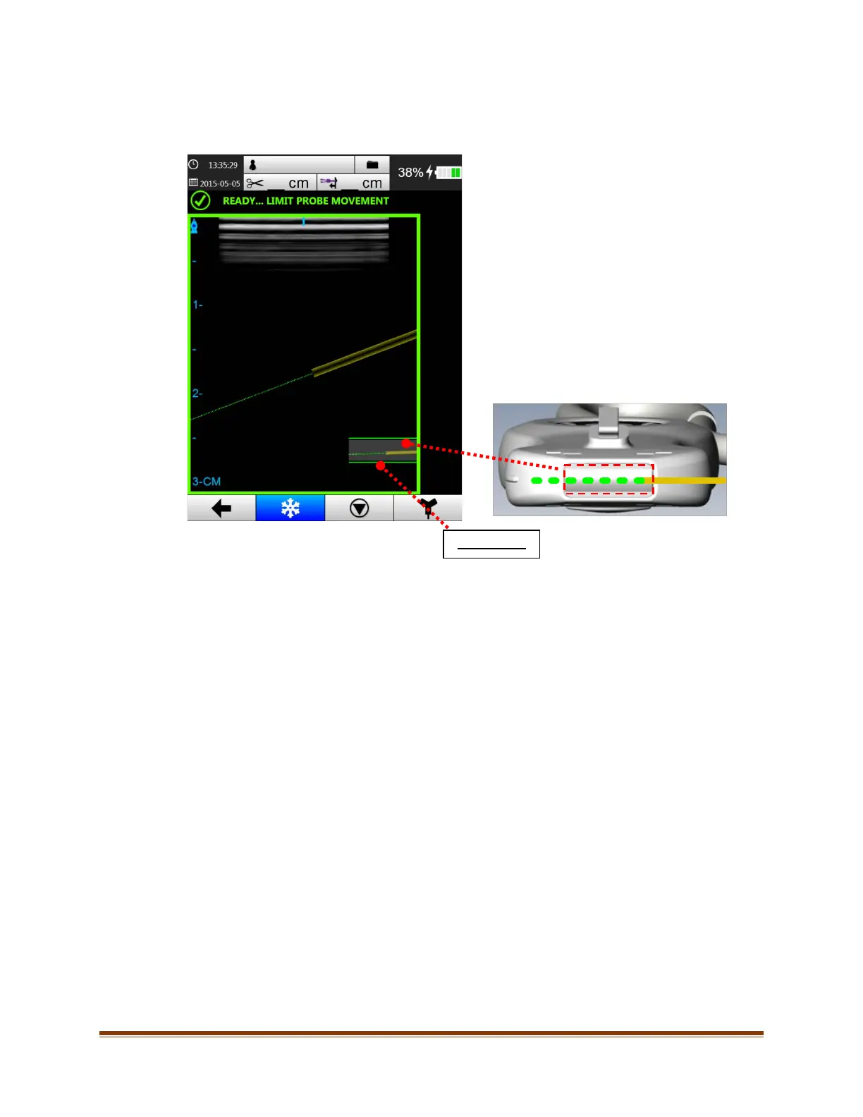 bottom right side of the screen. Since the needle is inserted “in plane” to the ultrasound bean, the Pinpoint™ GT