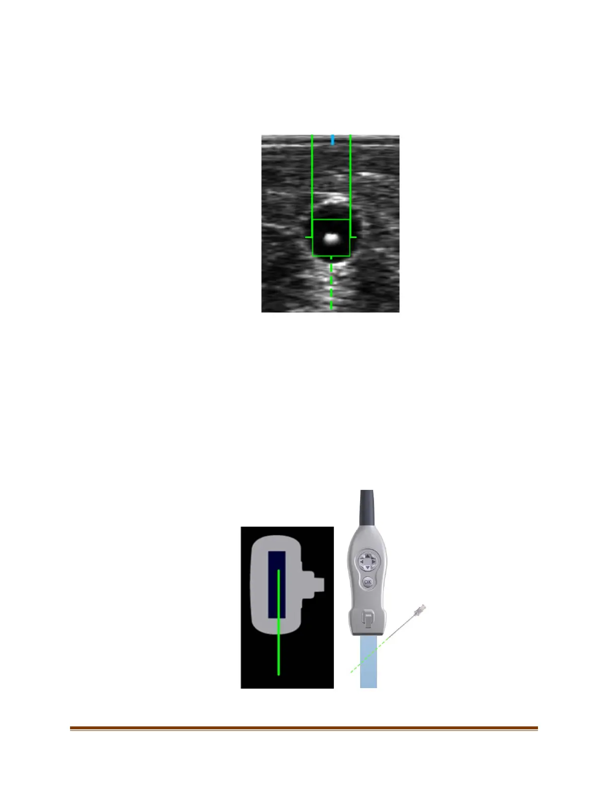 d. Proceed with insertion – watch needle advancement onscreen. The solid green lines represent the needle