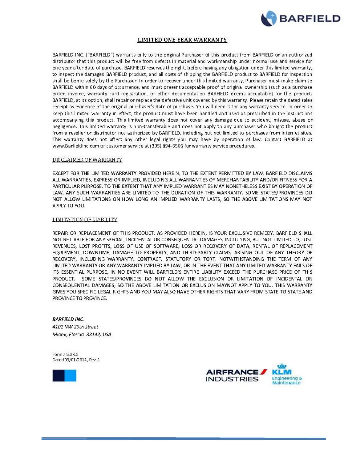 barfield 2311FA - LIMITED ONE YEAR WARRANTY