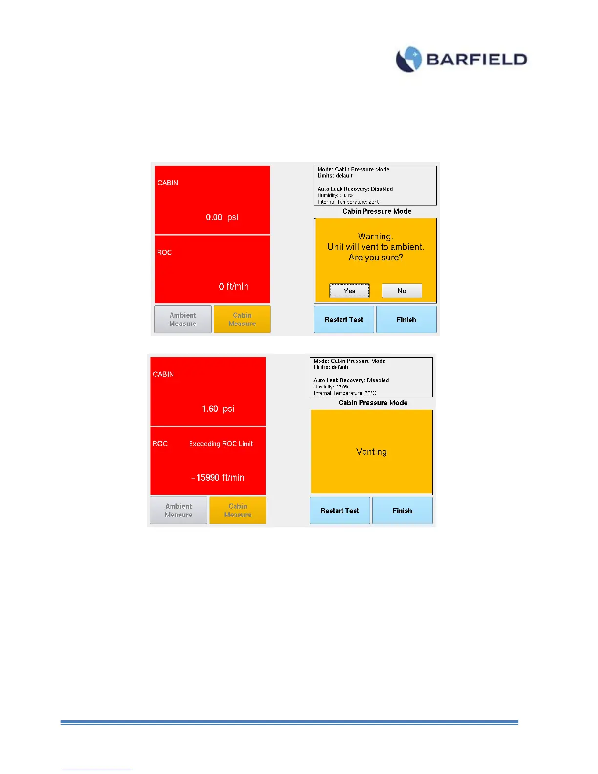 11. Once the test is completed, touch the Finish button to exit the Cabin Pressure Mode. A