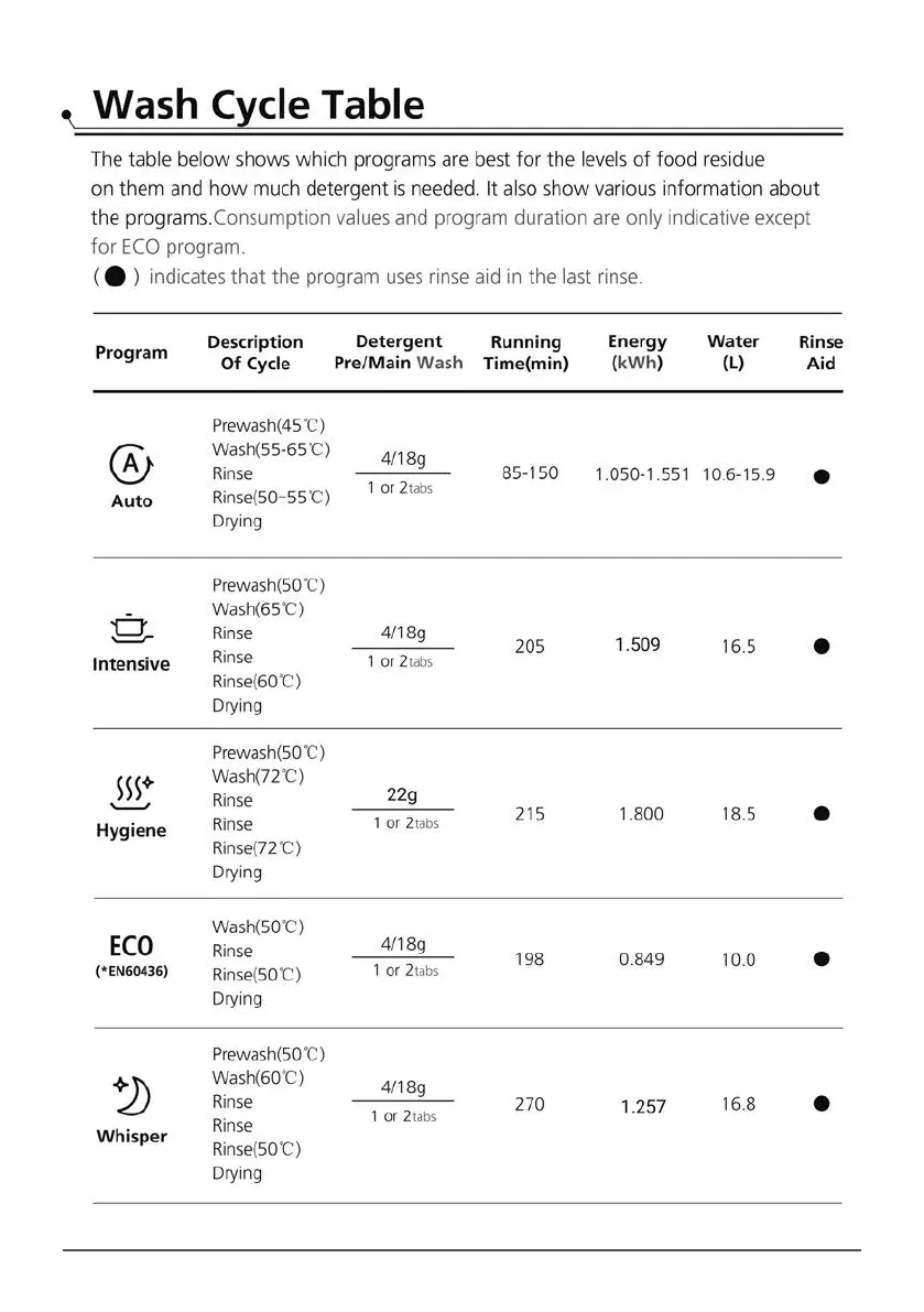 baridi DH167 - Wash Cycle Table