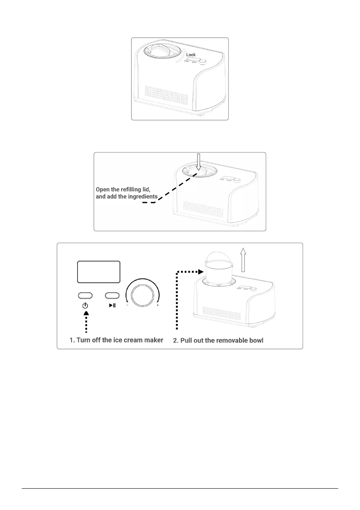 • Step 9. After the ice cream making cycle is over, turn off the machine rst, and then pull the removable bowl out.