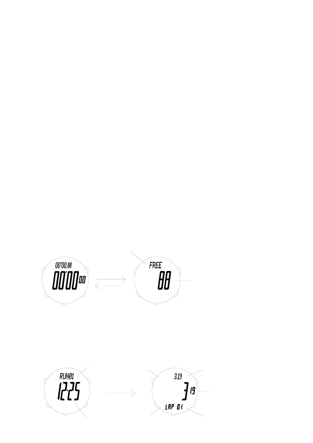 When the chronograph shows all zeros, press E and the number of unused lap (indicated by “FREE”) will be