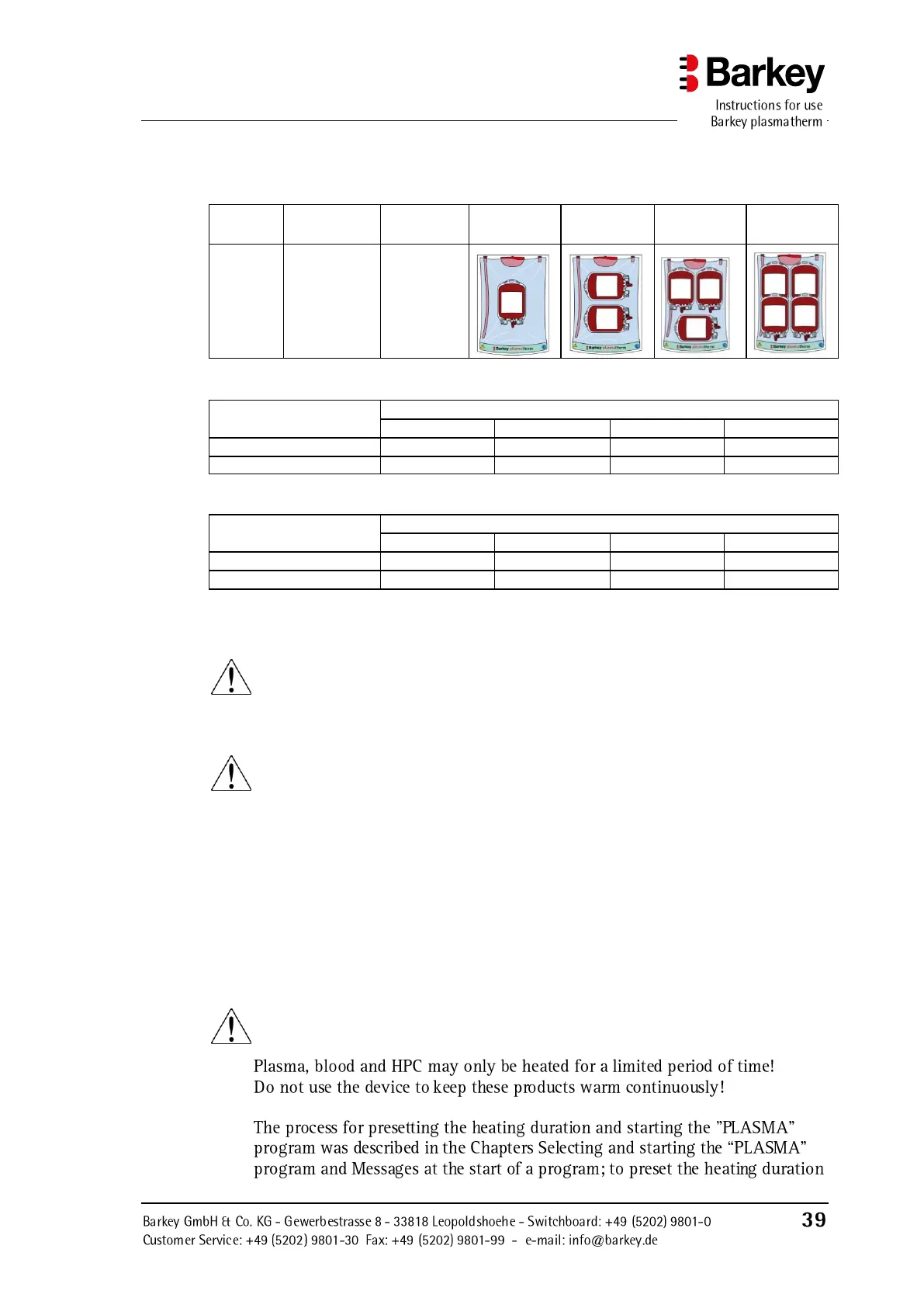 Plasma, blood and HPC may only be heated for a limited period of time!