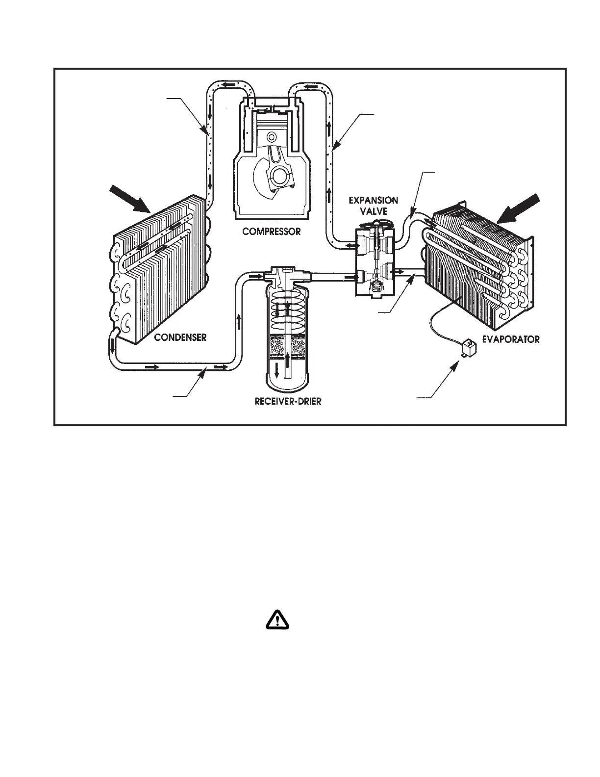 arrows inside the components and connecting hoses show the direction of refrigerant flow. The location of each
