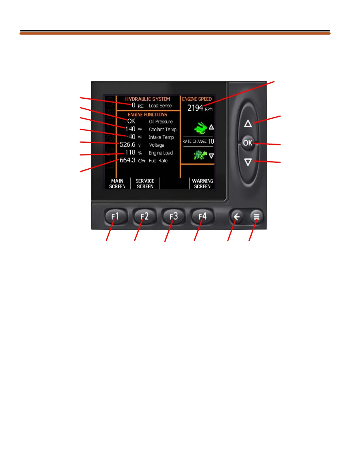 The Diagnostic Screen is used to get detailed information on engine and hydraulic systems.