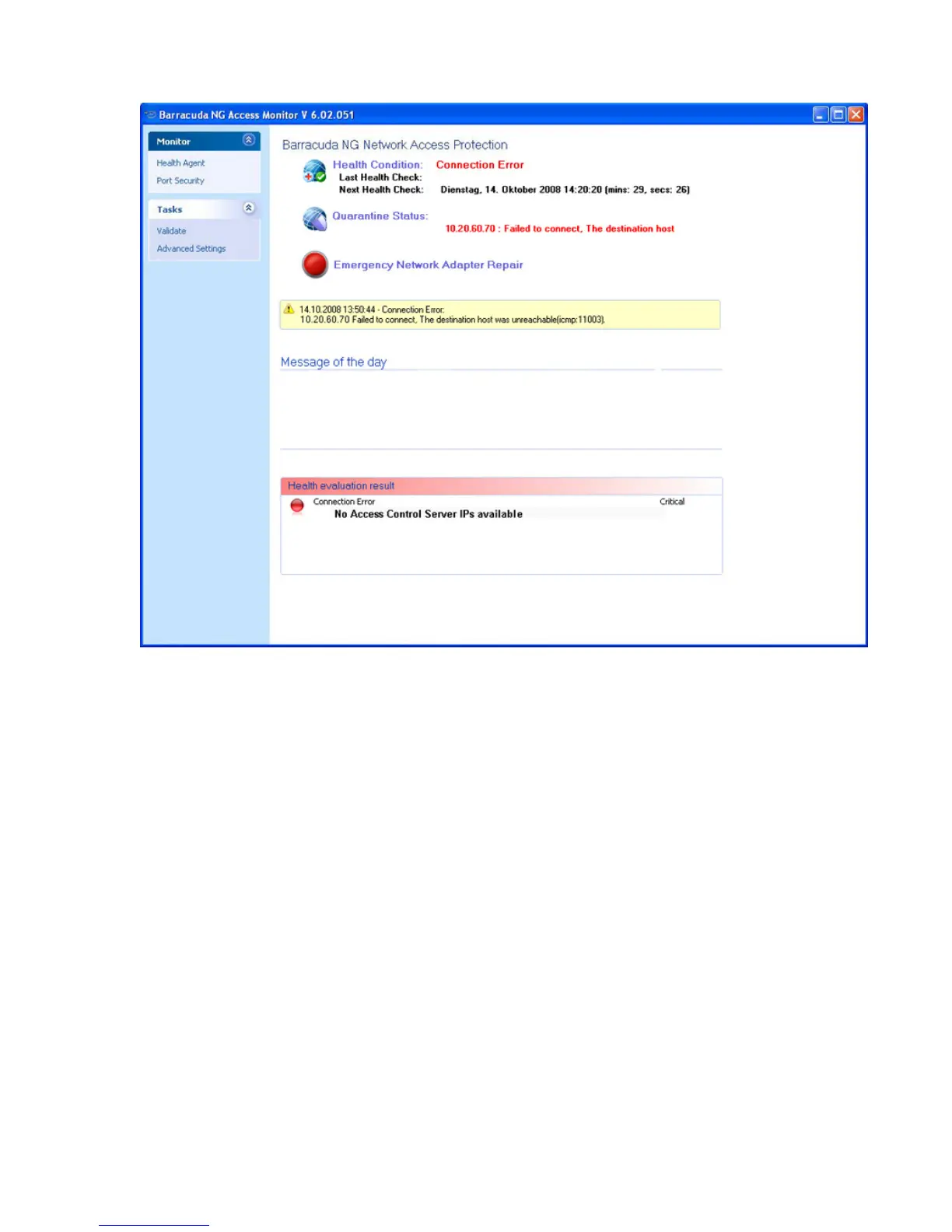 Fig. 11–6 Connection error because no Access Control Server IP addresses are configured