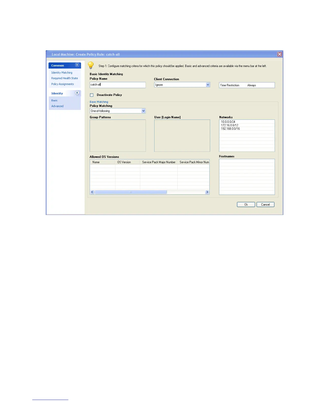 For the Identity Matching and Required Health State views, Basic and Advanced configuration dialogs