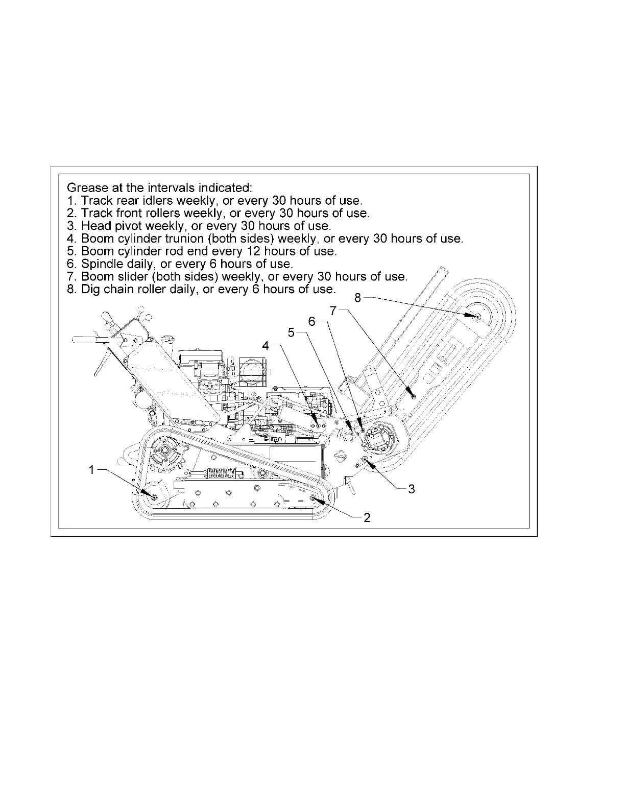Grease at the intervals indicated per the illustration of grease lubrication points. There is also a grease