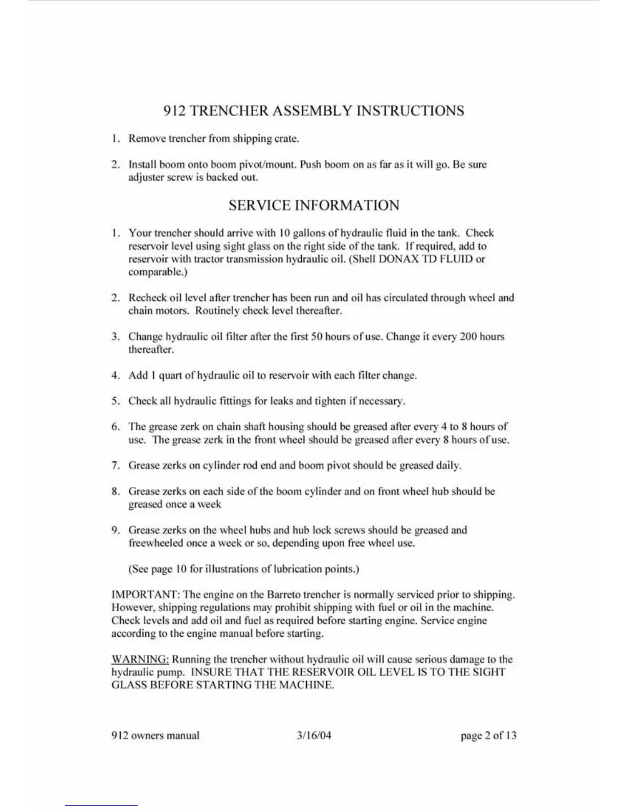 Barreto 912 - 912 TRENCHER ASSEMBLY INSTRUCTIONS; SERVICE INFORMATION