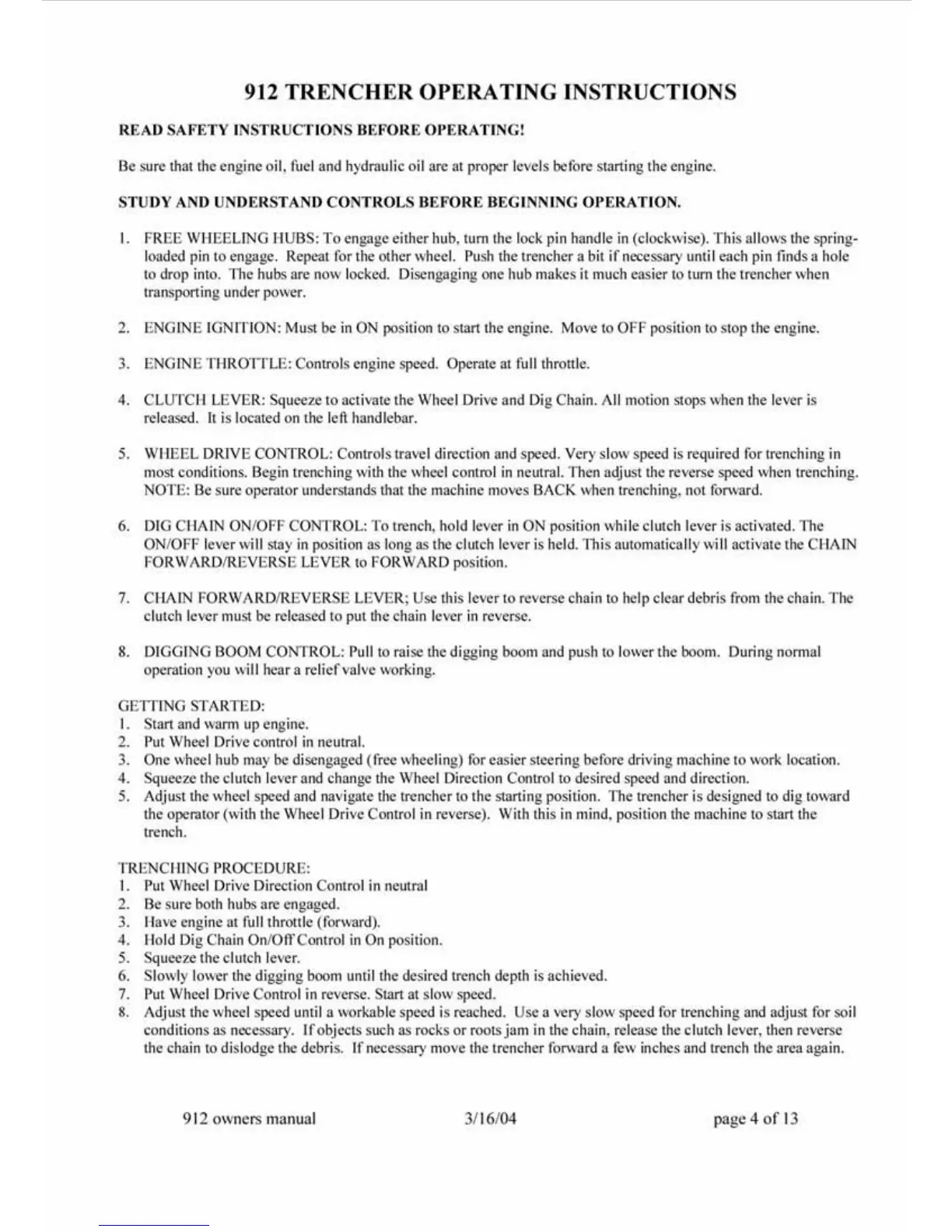 Barreto 912 - 912 TRENCHER OPERATING INSTRUCTIONS; GETTING STARTED; TRENCHING PROCEDURE