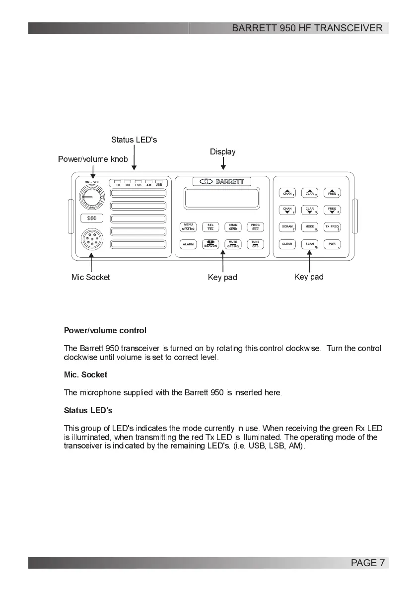 The Barrett 950 transceiver is turned on by rotating this control clockwise. Turn the control