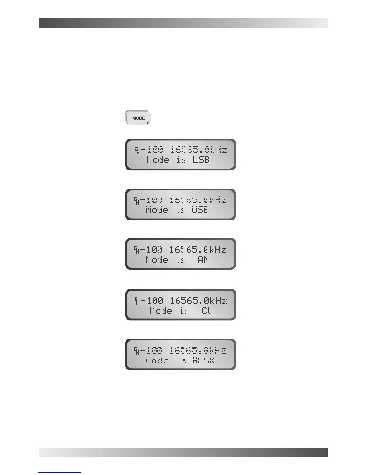 The mode key selects the mode of operation eg LSB, USB, AM, CW or AFSK. The mode