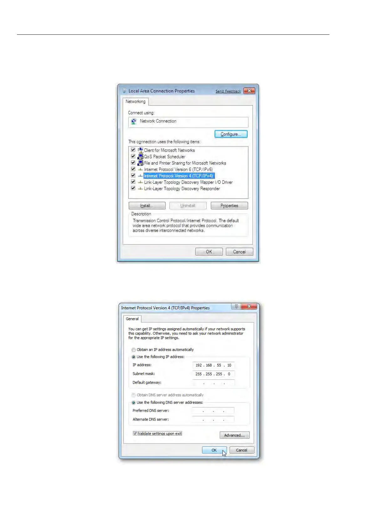 Go to "Internet Protocol Version 4 (TCP/IPv4)", open "Properties" and assign