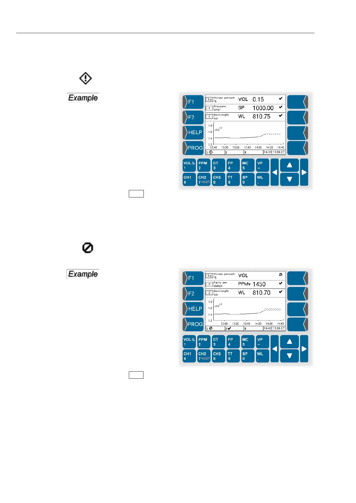 measurement operation is maintained. A warning sign appears in the info
