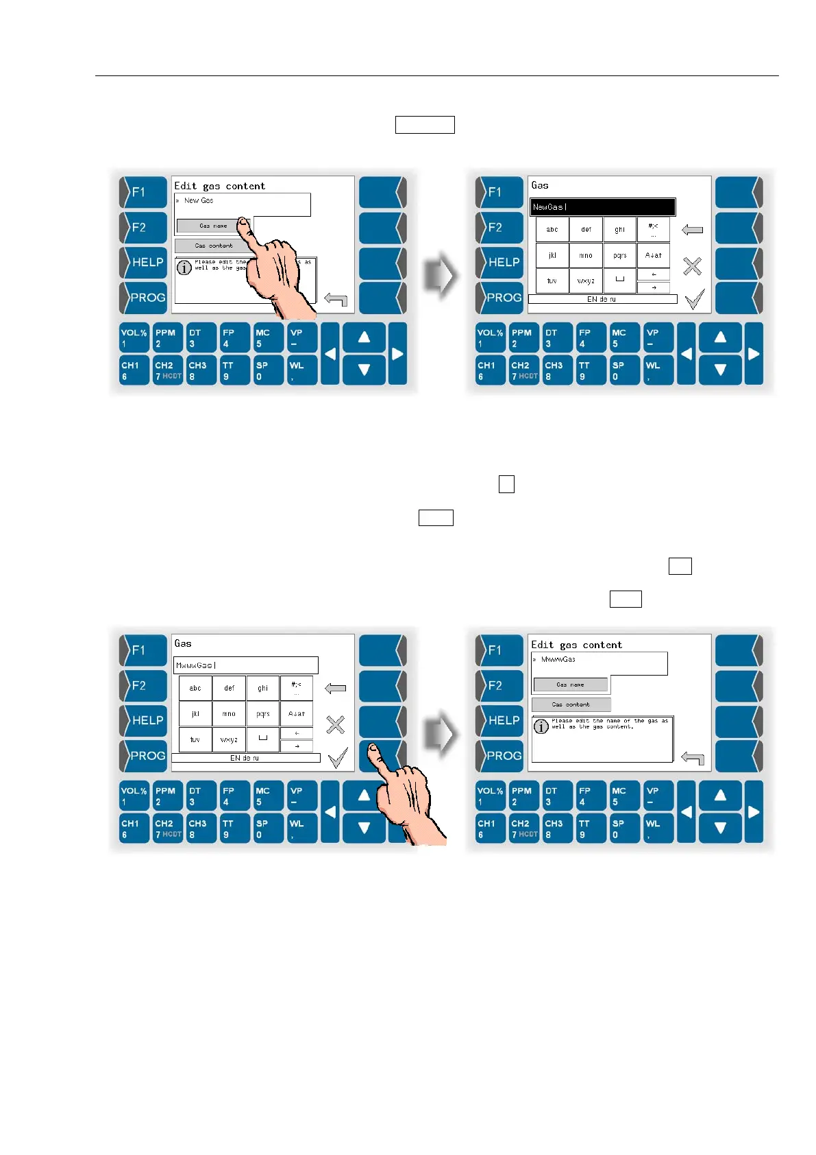 ● Touch the Gas name button. Use the following dialog to change the name