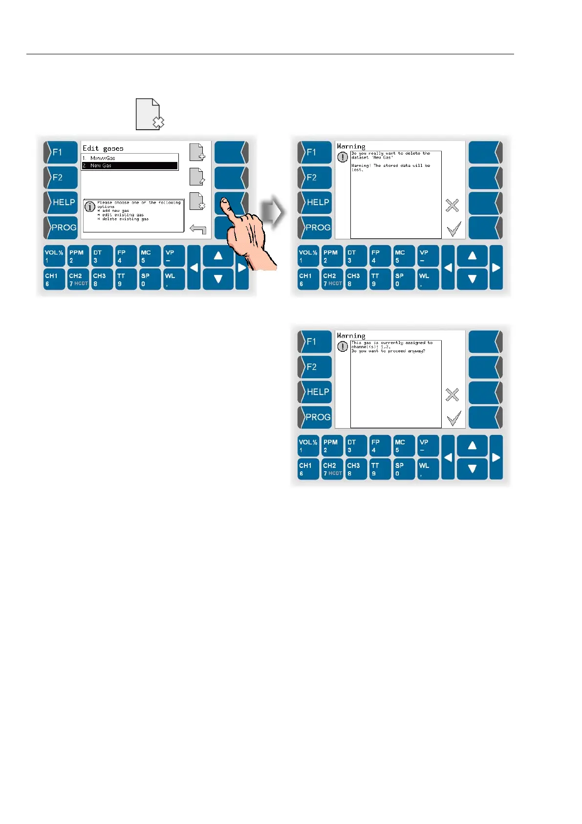 Select the gas that you want to delete from the list. Touch the „Delete“ soft-