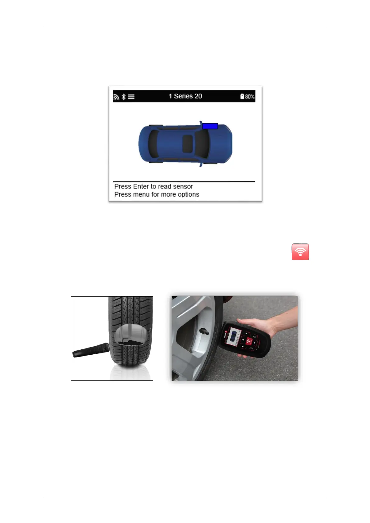 To test a sensor the tool should be placed alongside the valve stem and the ‘Test’ key