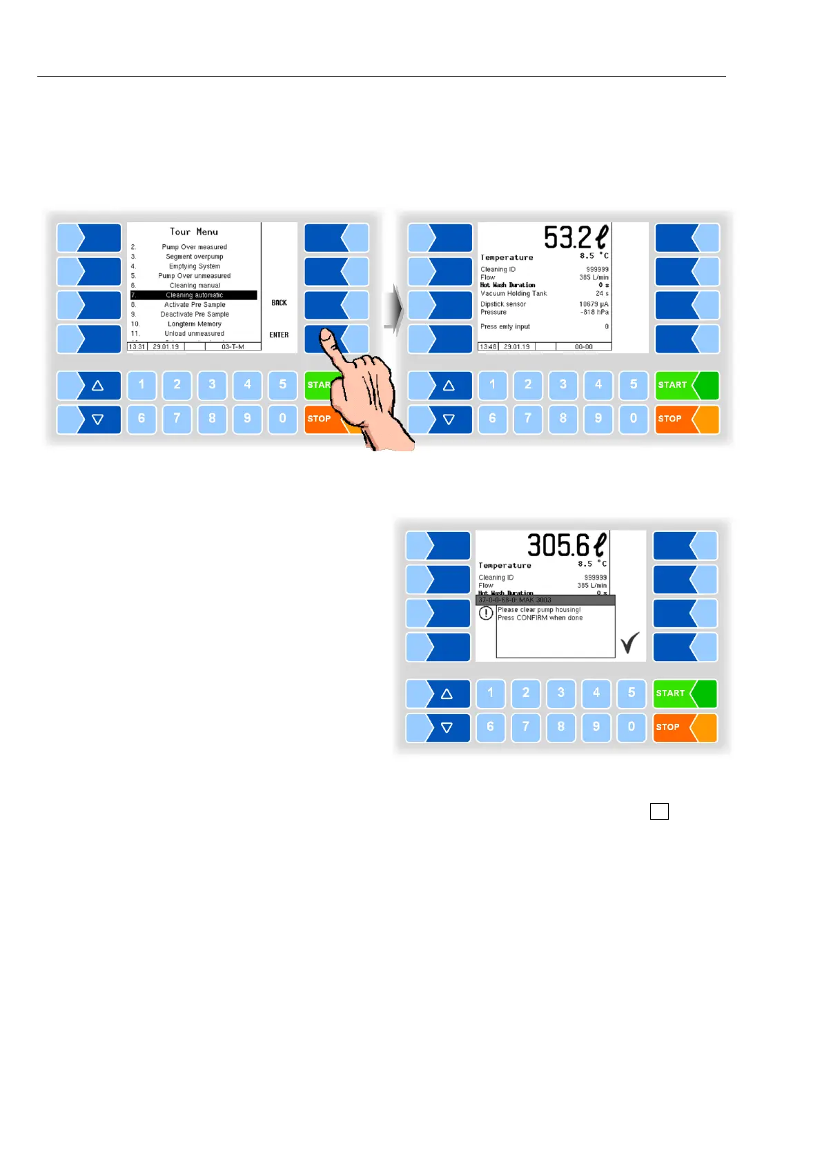 ● Then confirm emptying of the pump housing with the soft key .