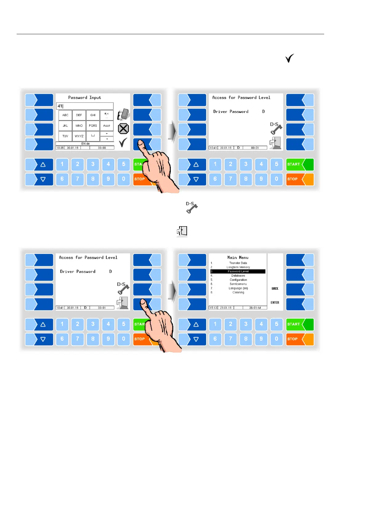 The password level (D) is then displayed, to which access is possible.