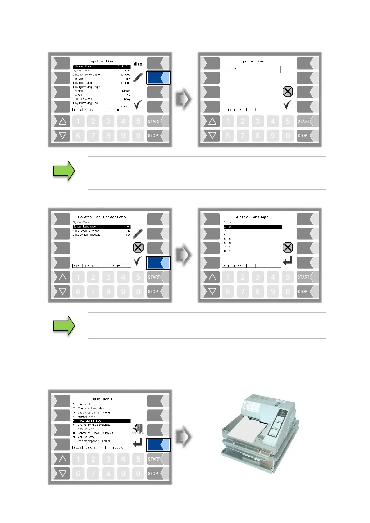Select the “Parameter Print Out” menu from the main menu. The current parameter settings are output
