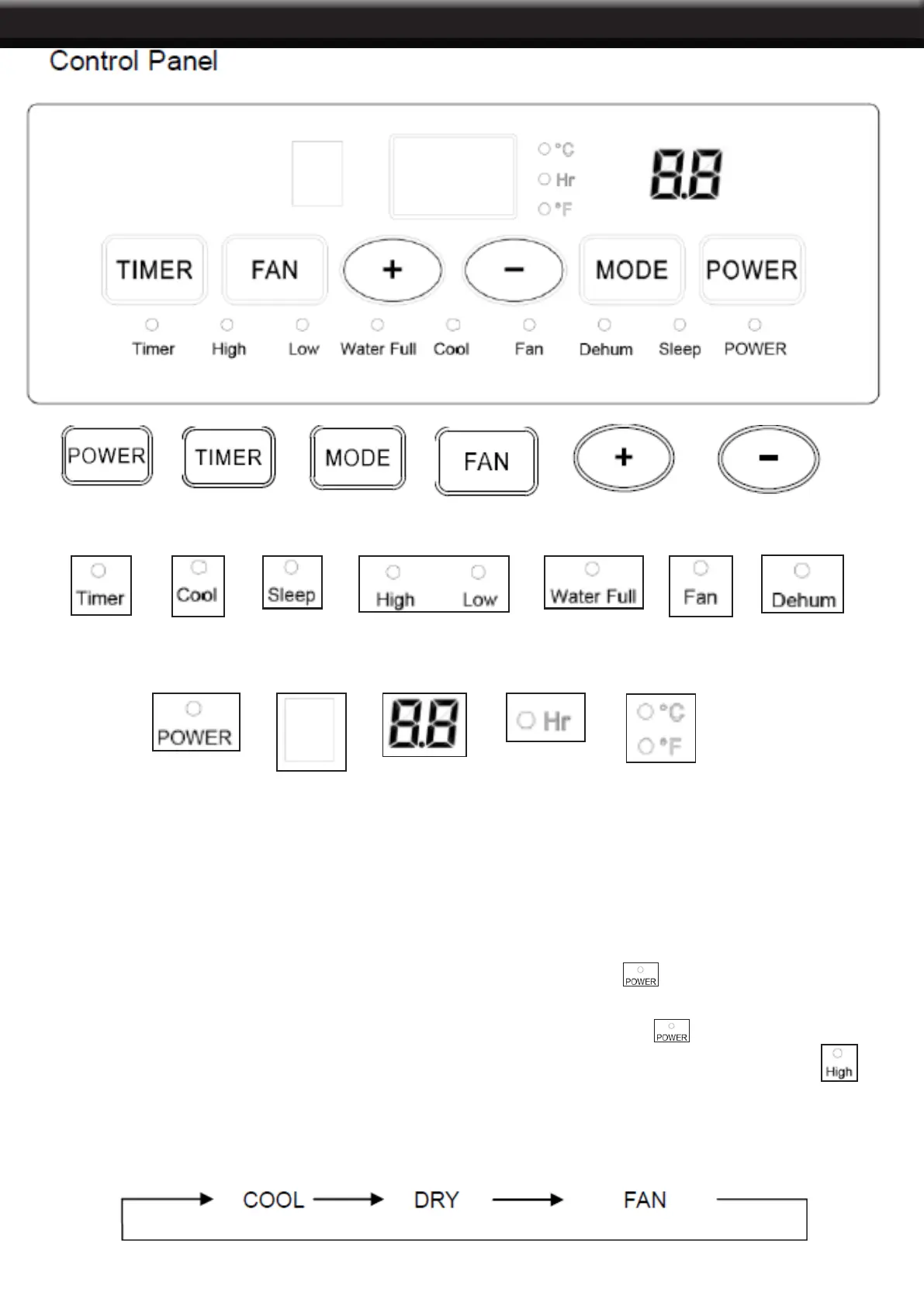 Control Panel Operation: This unit features Cool, Dehumidifying, Fan and Sleep mode operations.