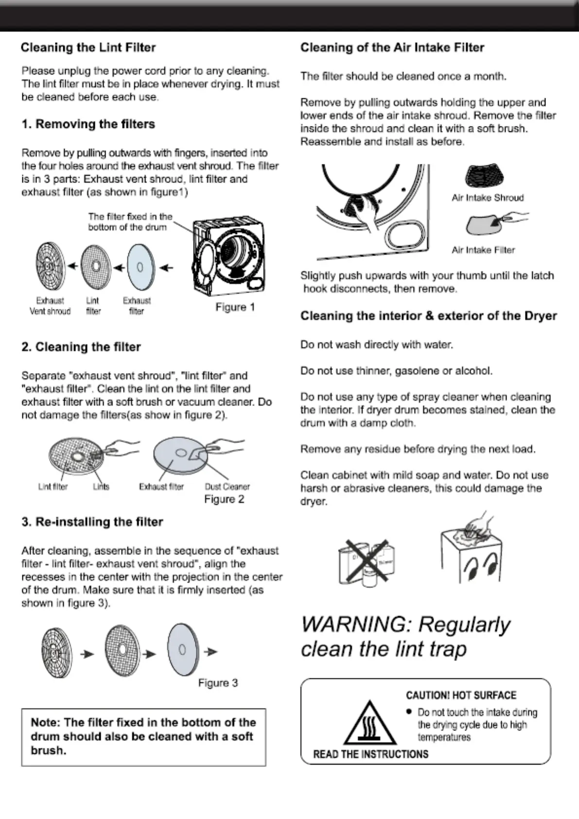 Barton 99821 - Maintenance; Cleaning the Lint Filter; Cleaning the Air Intake Filter; Cleaning the Interior & Exterior