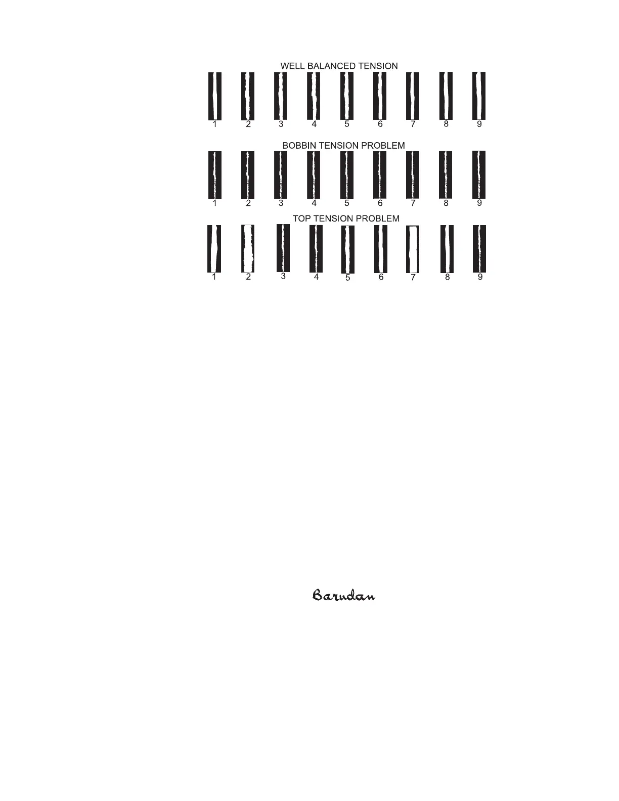 tensioning points. Letters #1, #2 and #7 show too much bobbin