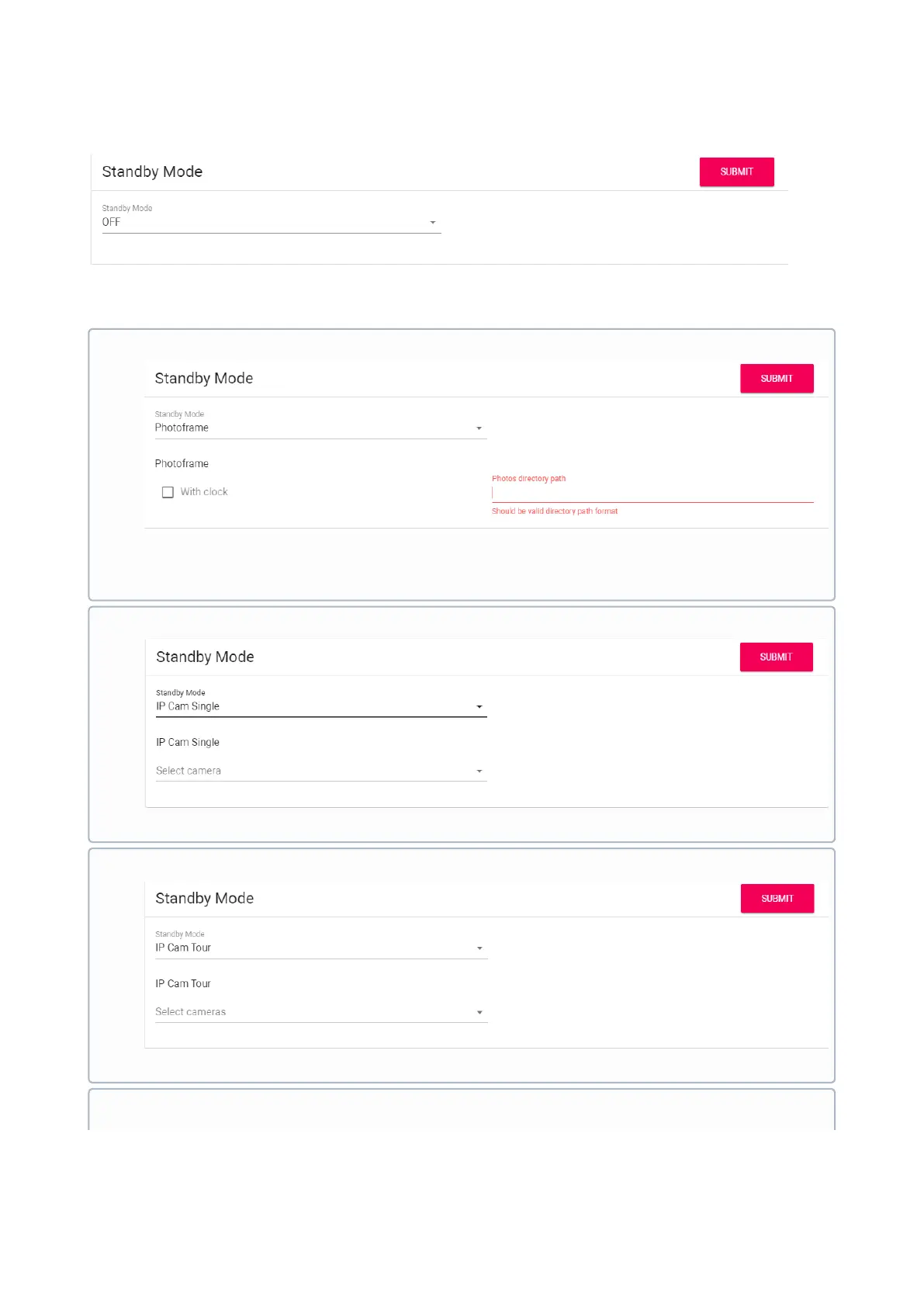 Select camera: Selection of IP camera which will be displayed in the stand by mode.