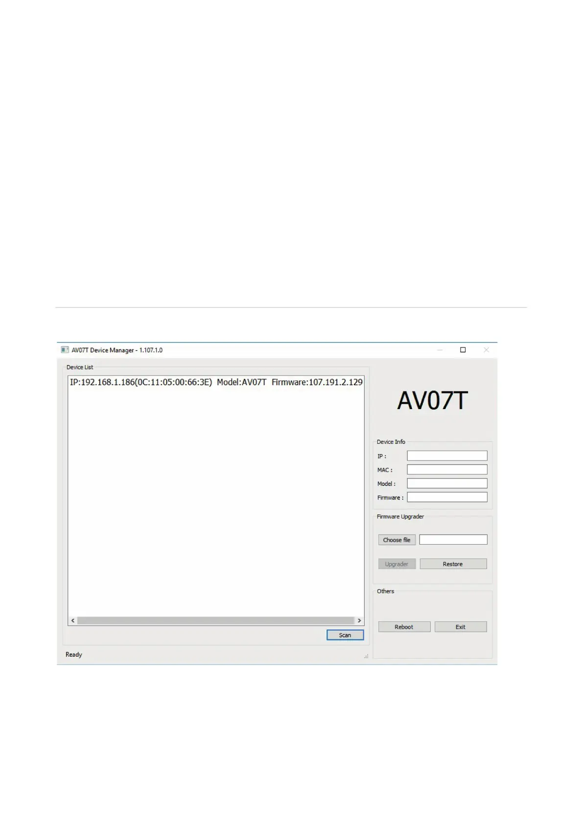 Press the “Scan” button and program window will display IP addresses of all AV-07T outdoor