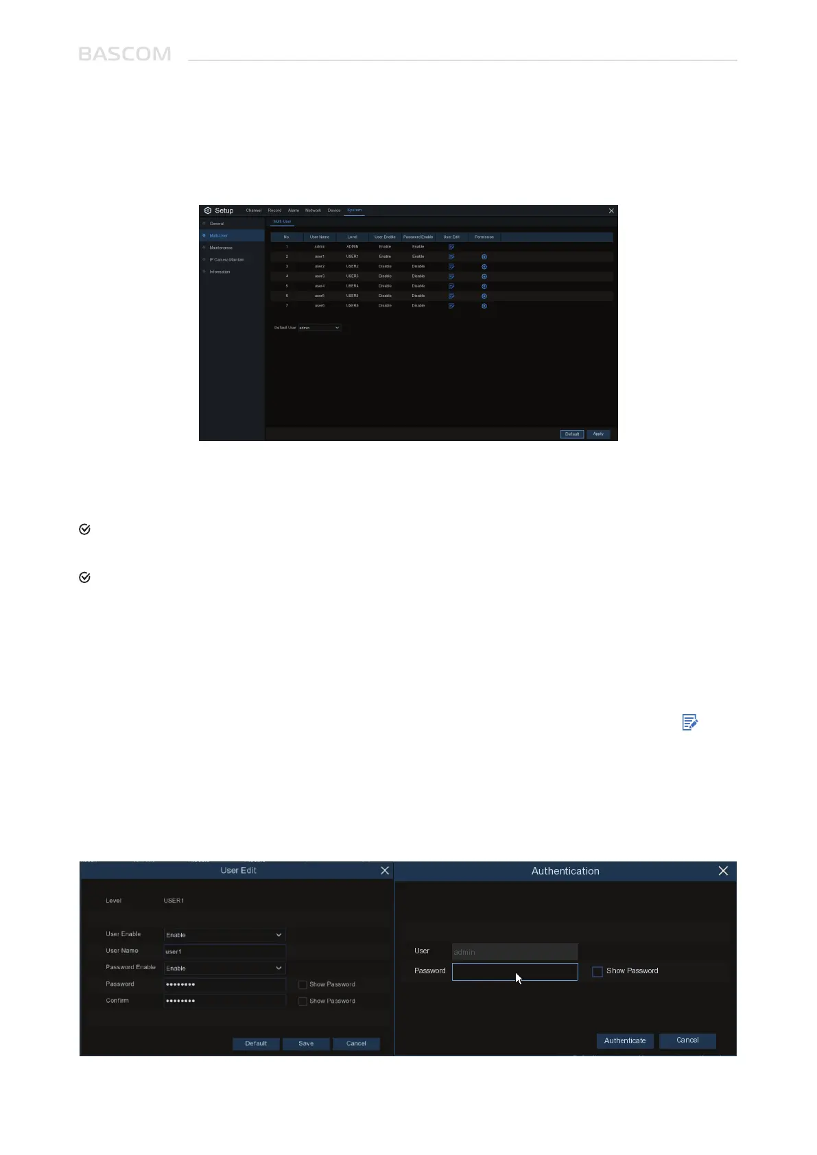 This menu allows you to configure the user name, password and user permission.