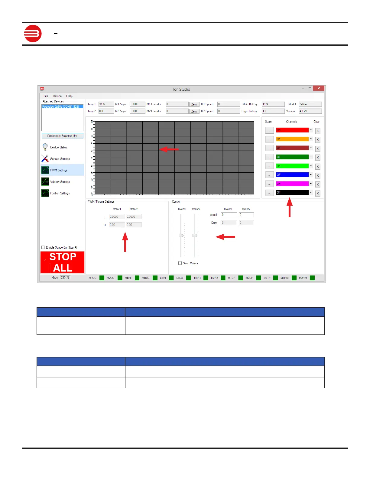 The PWM settings screen is used to control RoboClaw for testing. Sliders are provided to control