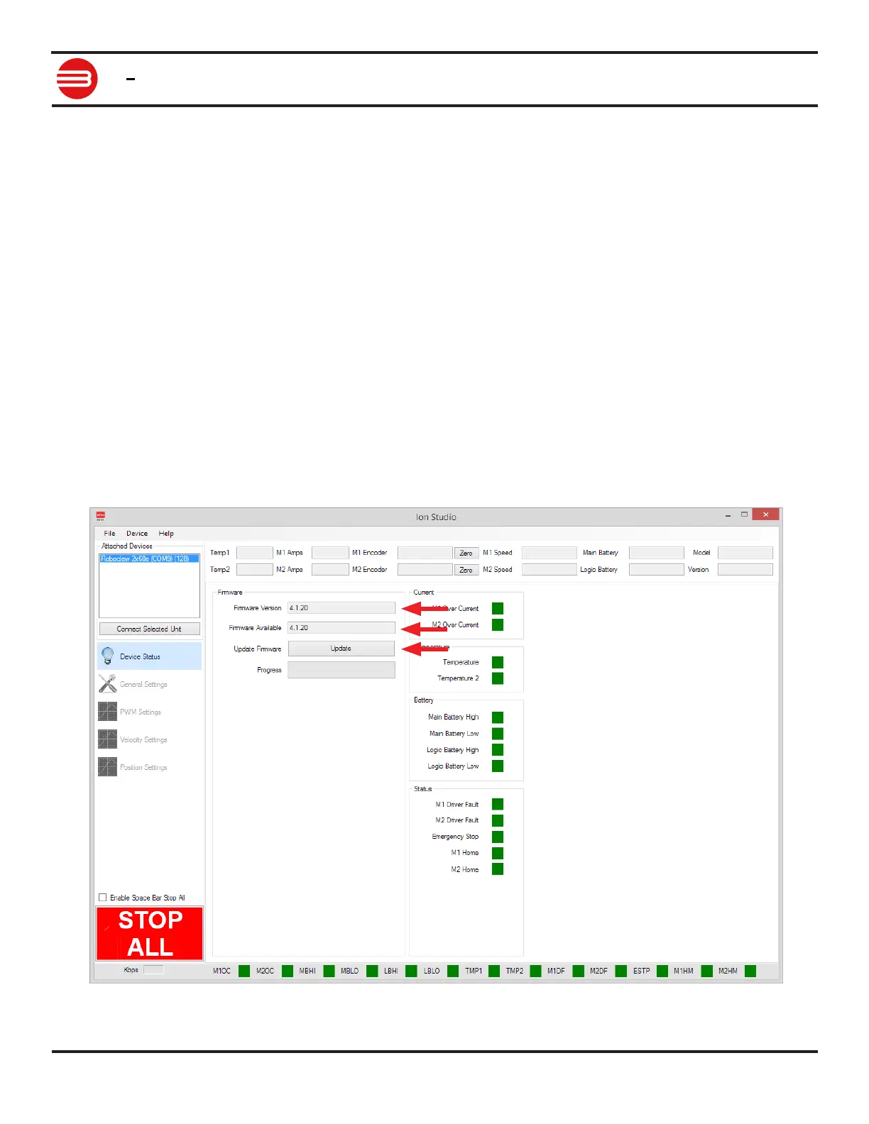 Once Motion Studio detects the motor controller it will display the current rmware version in