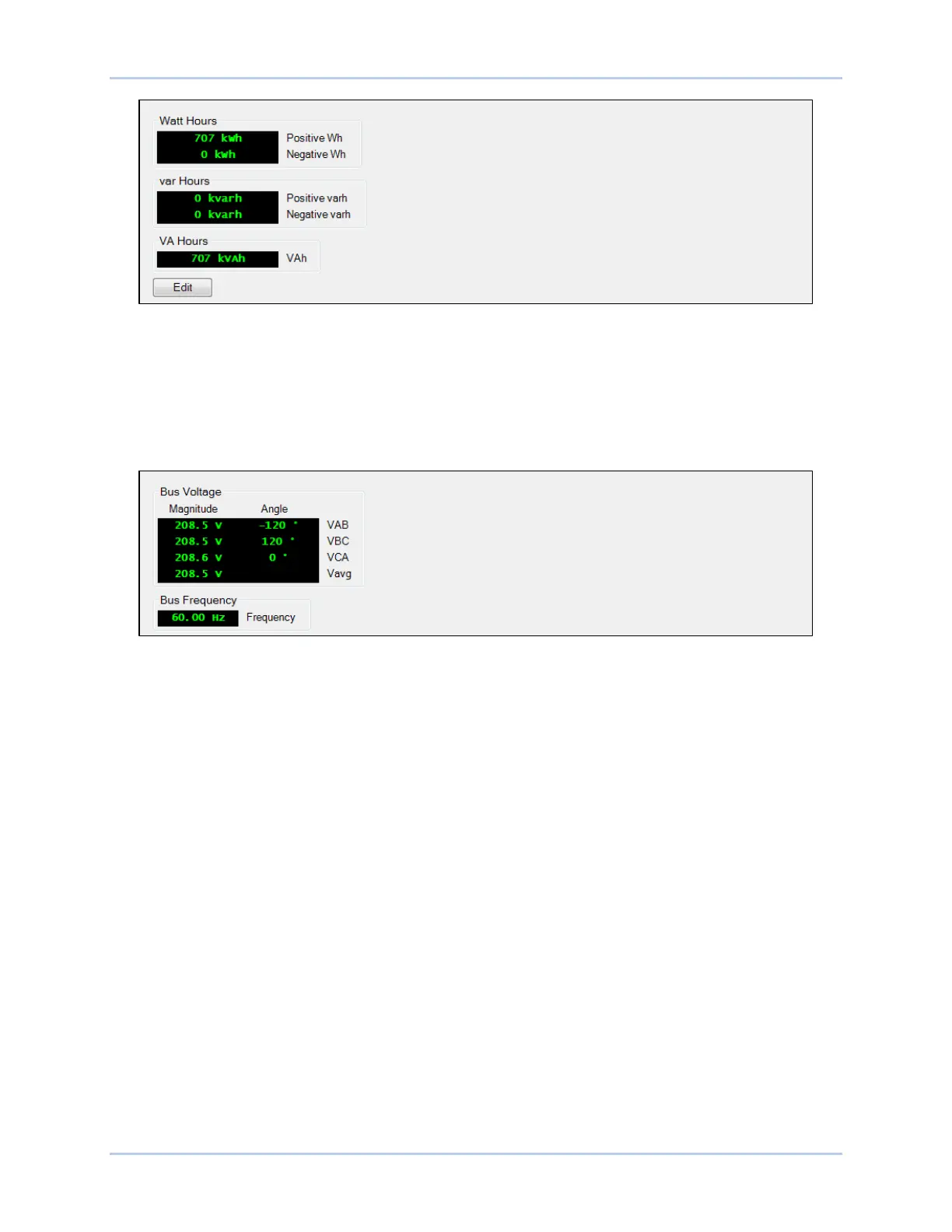 phases A and C (Vca), and the average bus voltage. The frequency of the bus voltage is also metered.