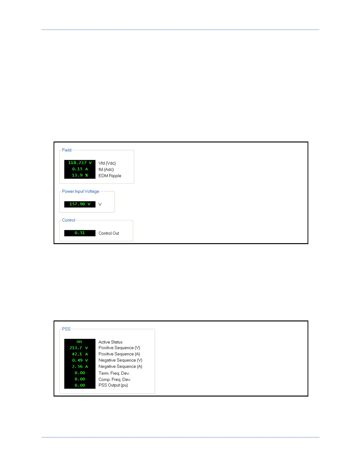 Metered field parameters include the field voltage (Vfd), current (Ifd), and exciter diode ripple. The exciter