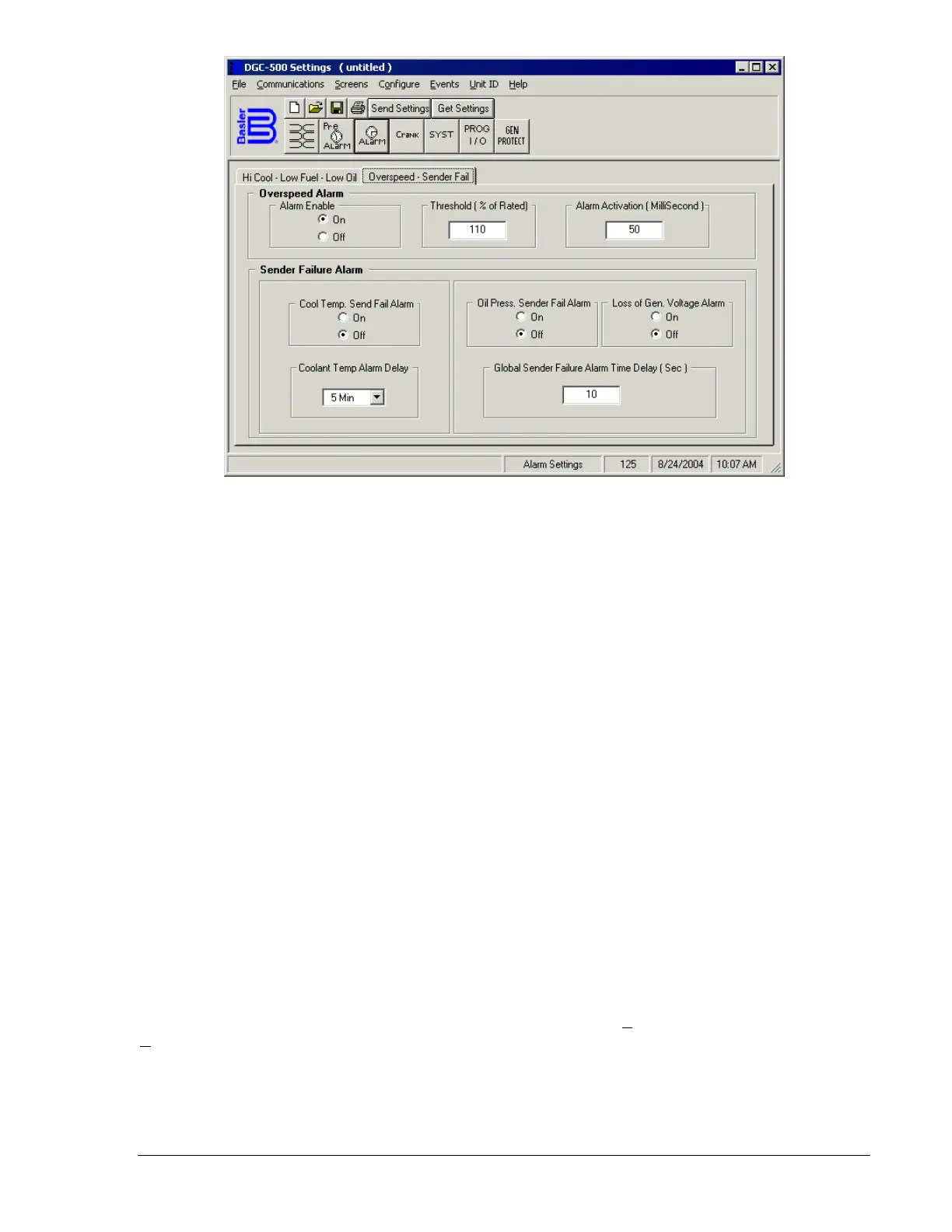 Sender Failure Alarm - Loss of Gen. Voltage Alarm. This setting enables and disables alarm annunciation