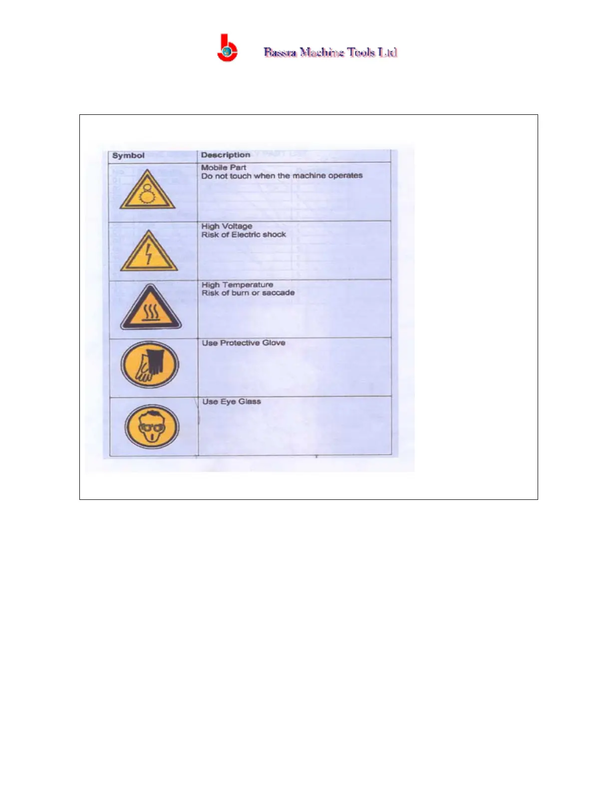 Bassra Machine Tools BMT 2000 - Warning Symbols