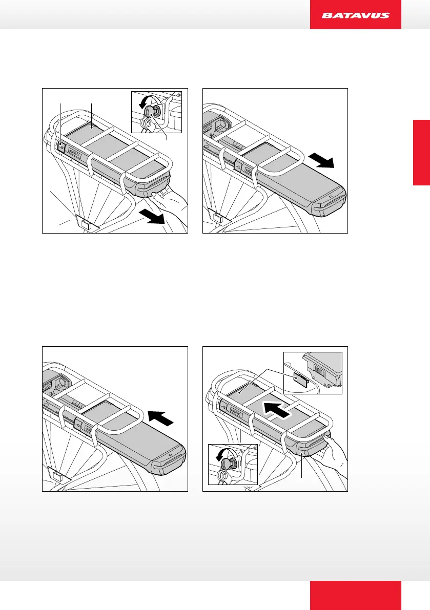 1. Insert the supplied key (A) into the lock of the battery pack (B)