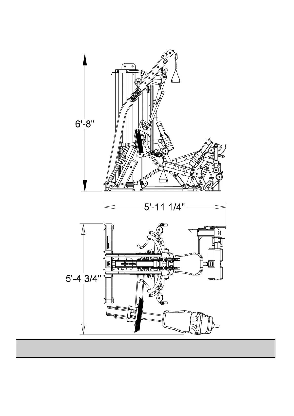 The Fusion with Leg Press has a layout dimension of 5’-5” (width) x 5’-11 1/4” (length) x 6’-11” (height).