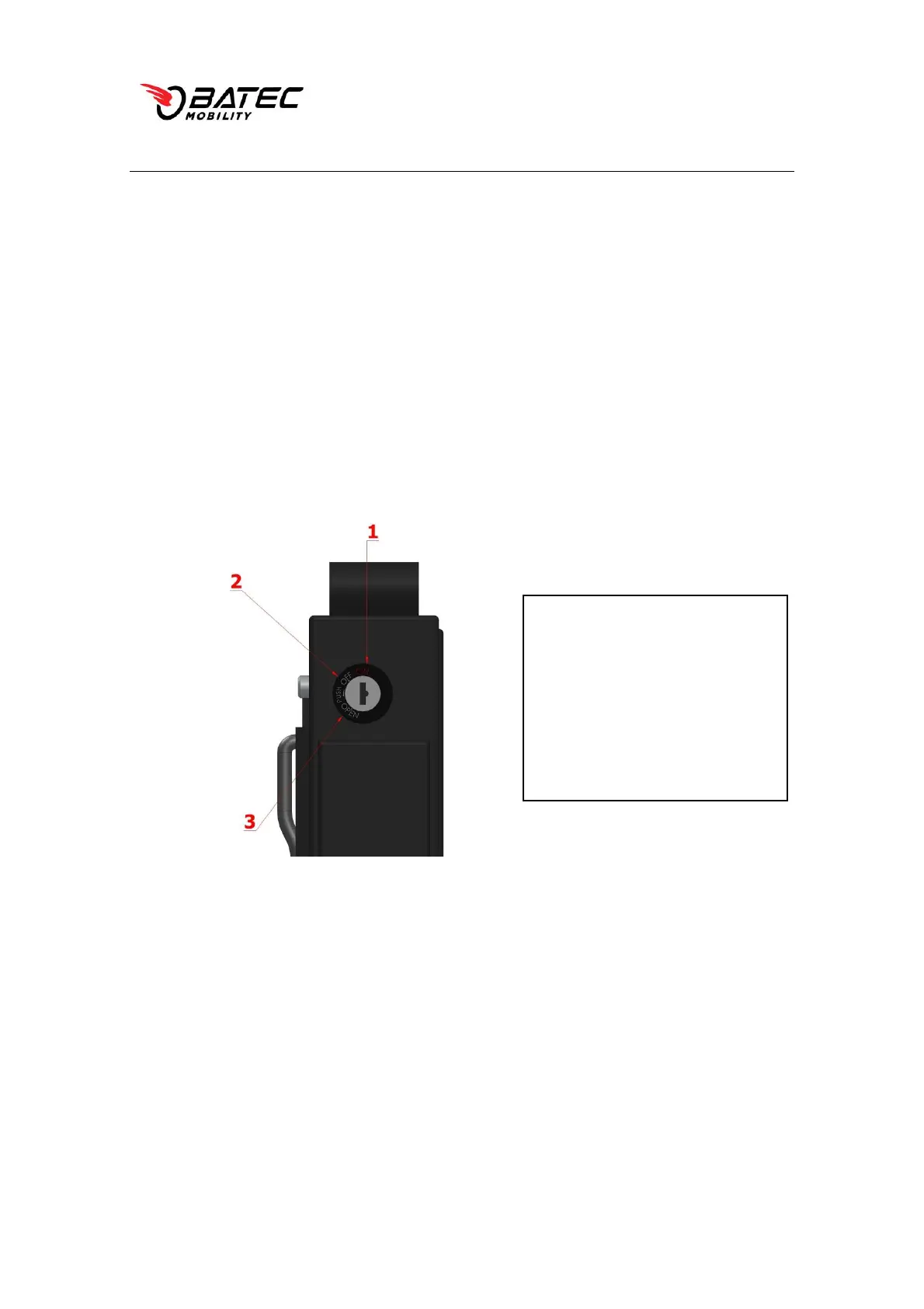 • Turn on: Turn the key on the right side of the battery clockwise to the ON