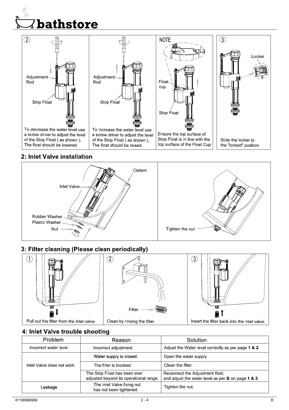 bathstore 41100060930 - Inlet Valve Installation; Filter Cleaning; Inlet Valve Trouble Shooting