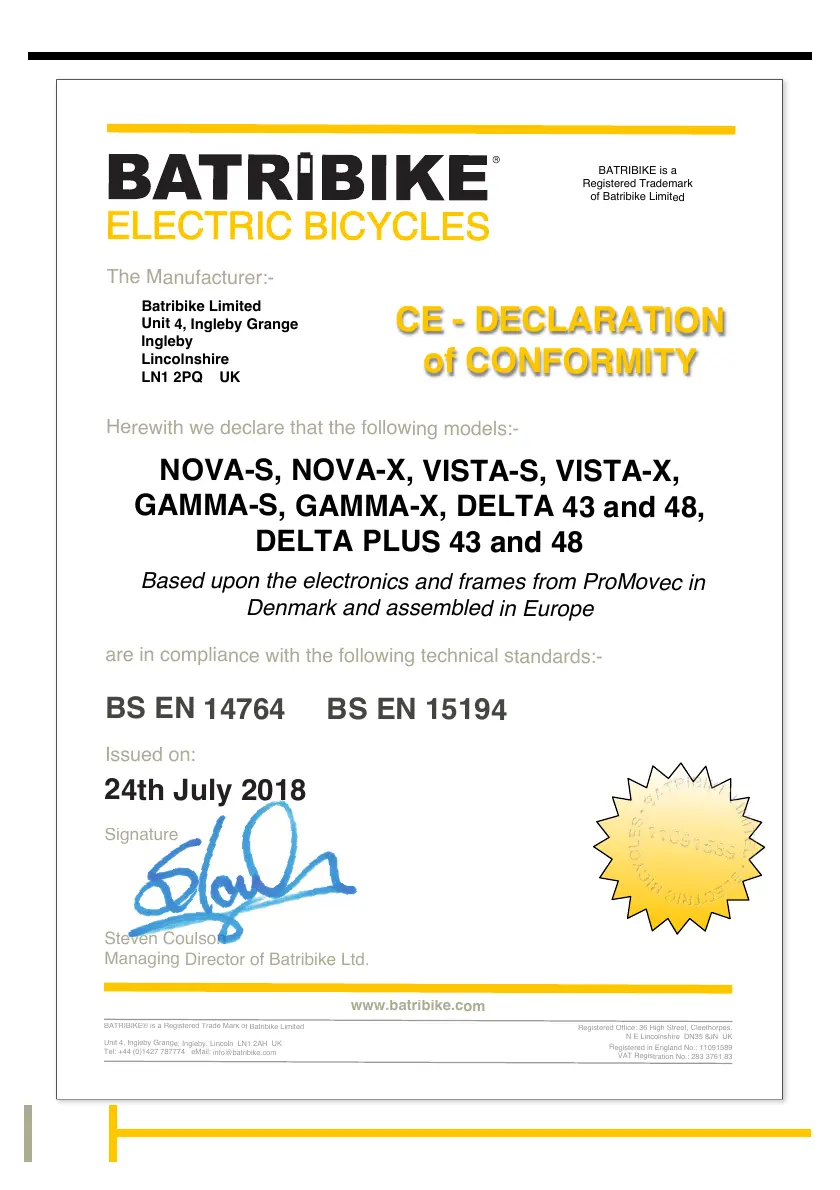 Batribike Nova S - Certificate of Compliance