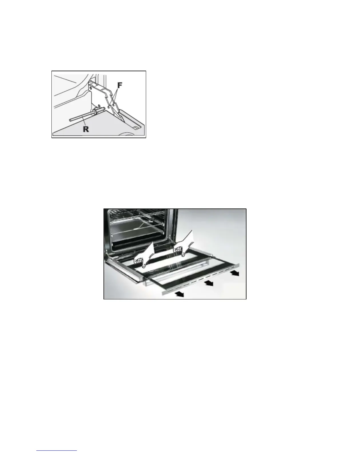 o Open the oven door and insert a rivet or nail (R) in the hole (F)