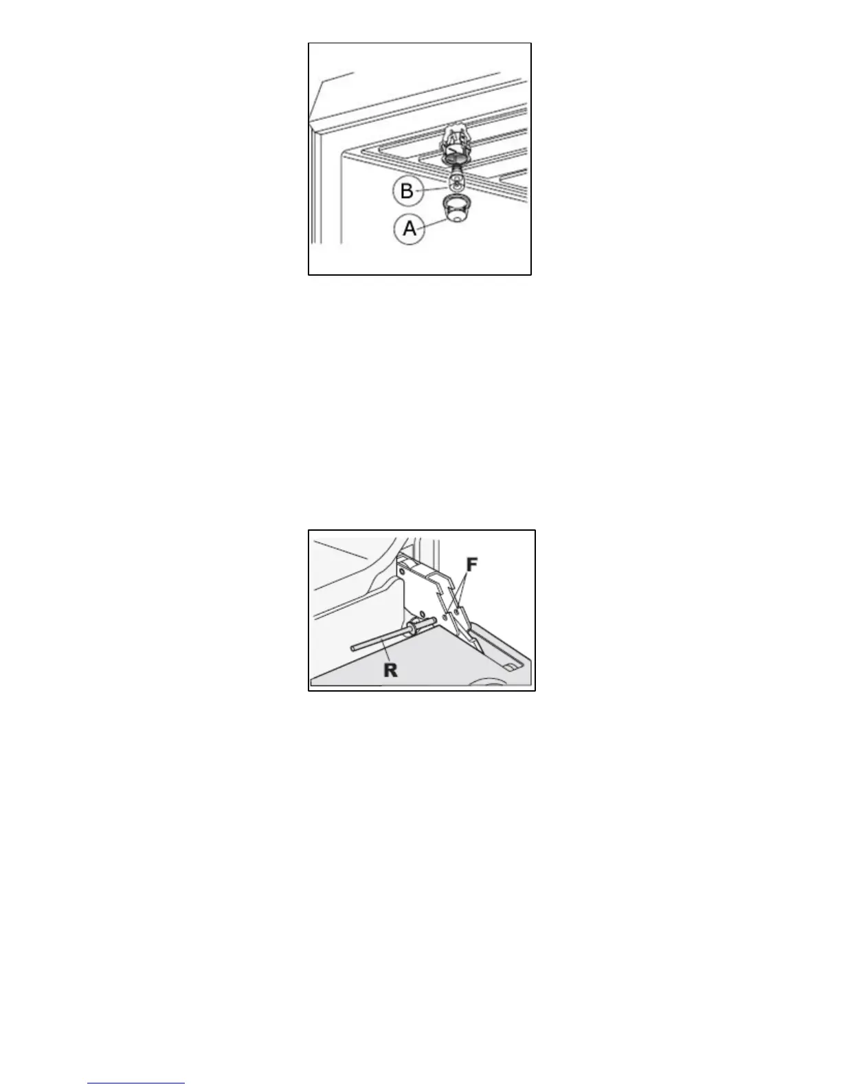 o Open the oven door and insert a rivet or nail (R) in the hole (F)