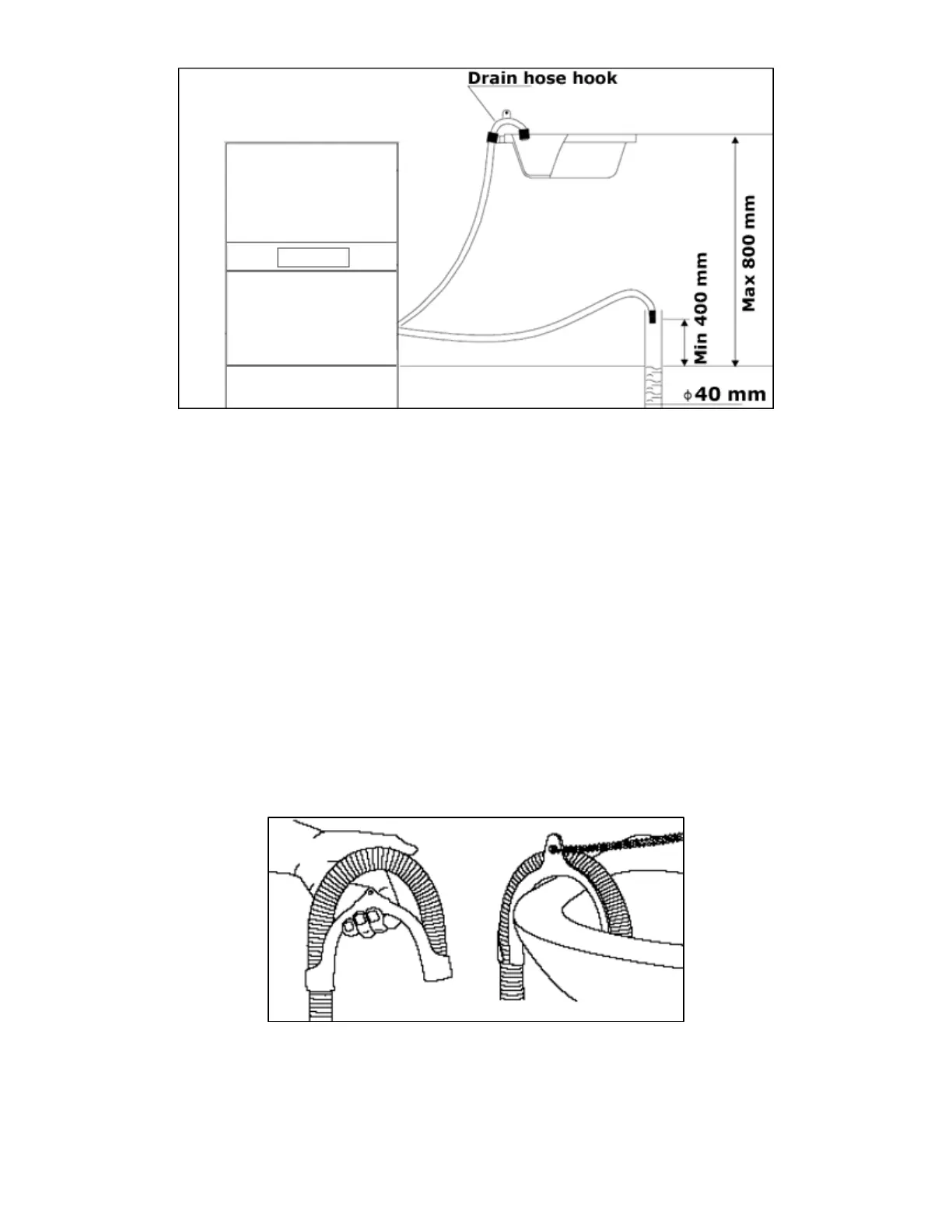 9 A drain hose hook is supplied and should be attached in one of