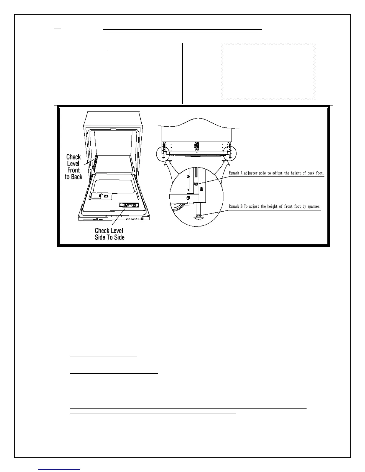 TURN THE FRONT FEET UNTIL THE DISHWASHER IS LEVEL (PLEASE SEE ‘REMARK B’ IN THE ABOVE FIGURE).