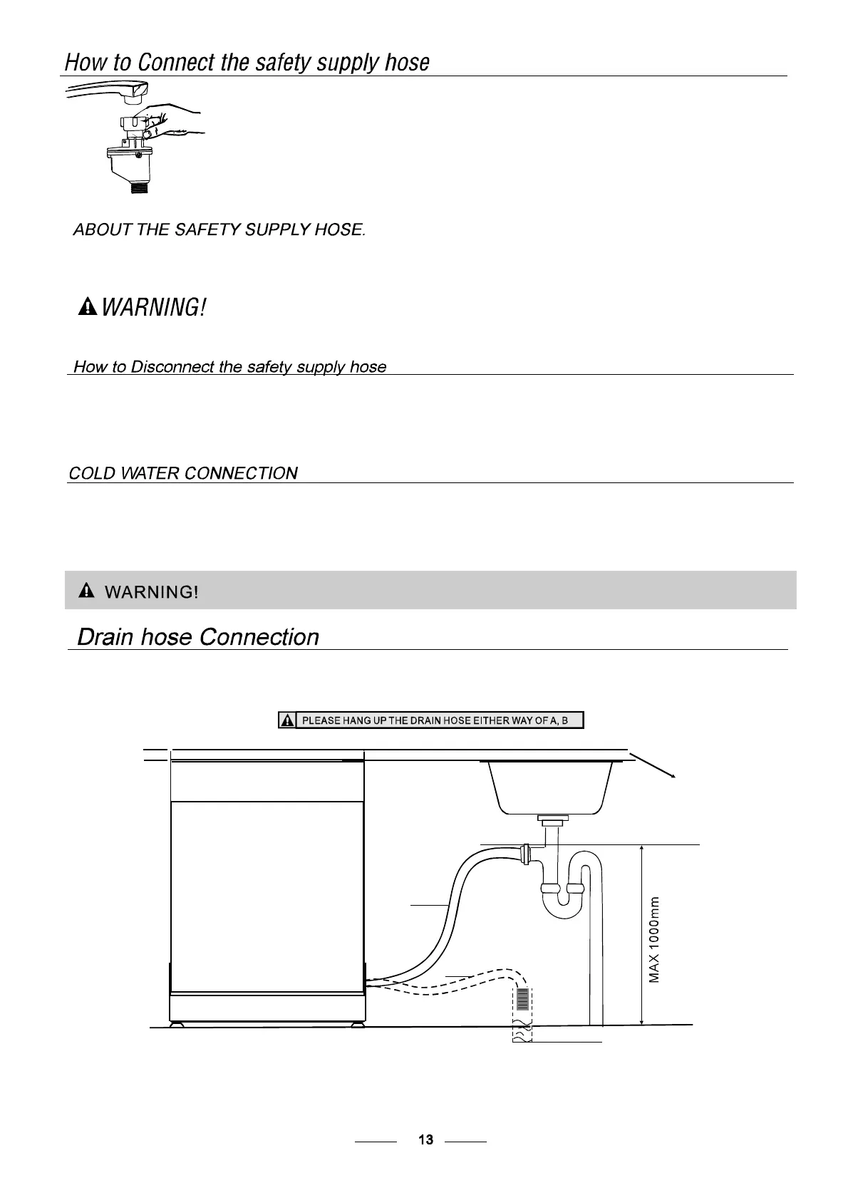 Ins ert t he drai n hos e int o a d rain pip e wi th a mini mum di amet er of 40mm, or l et it r un in to th esi nk, mak ing sure t o